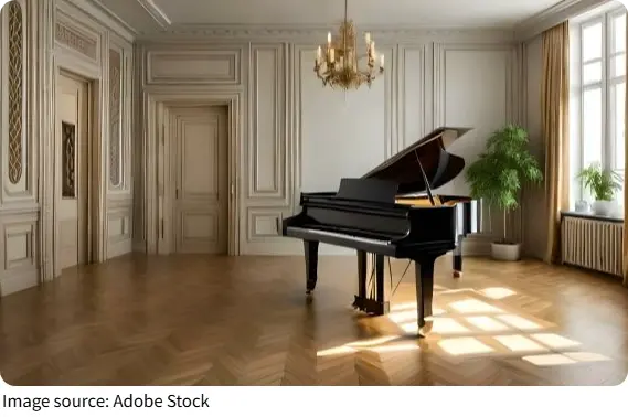 Grand pianos are sensitive to humidity and temperature. Maintain a stable environment to prevent warping or string damage.