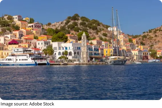 Instead of large crowds and busy nightlife, Symi offers slow walks along the harbor, clear turquoise coves, and charming cafés where you can watch fishing boats come and go.