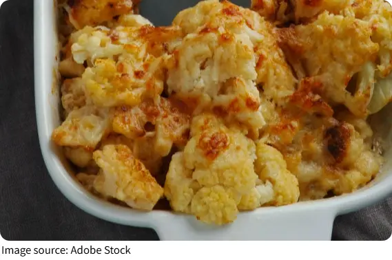 This dish is built around soft cauliflower and a creamy cheese sauce. The cauliflower provides a mild base, while the sauce adds richness and warmth. Baking everything together helps the flavors blend smoothly. Serving it in a vintage bowl adds a sense of care and nostalgia, making the meal feel more personal and welcoming.