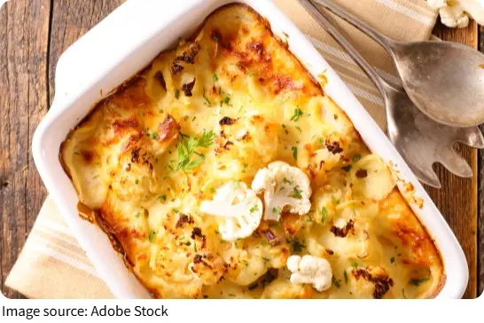 Today we are making a warm and familiar dish: cauliflower cheese served in a vintage bowl. This is a simple baked dish where tender cauliflower is covered with a smooth cheese sauce and gently baked until comforting and inviting.