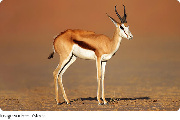 The springbok belongs to the antelope family. It has adapted to dry land over time. Its strong survival ability helps it live in open plains and semi-desert areas.